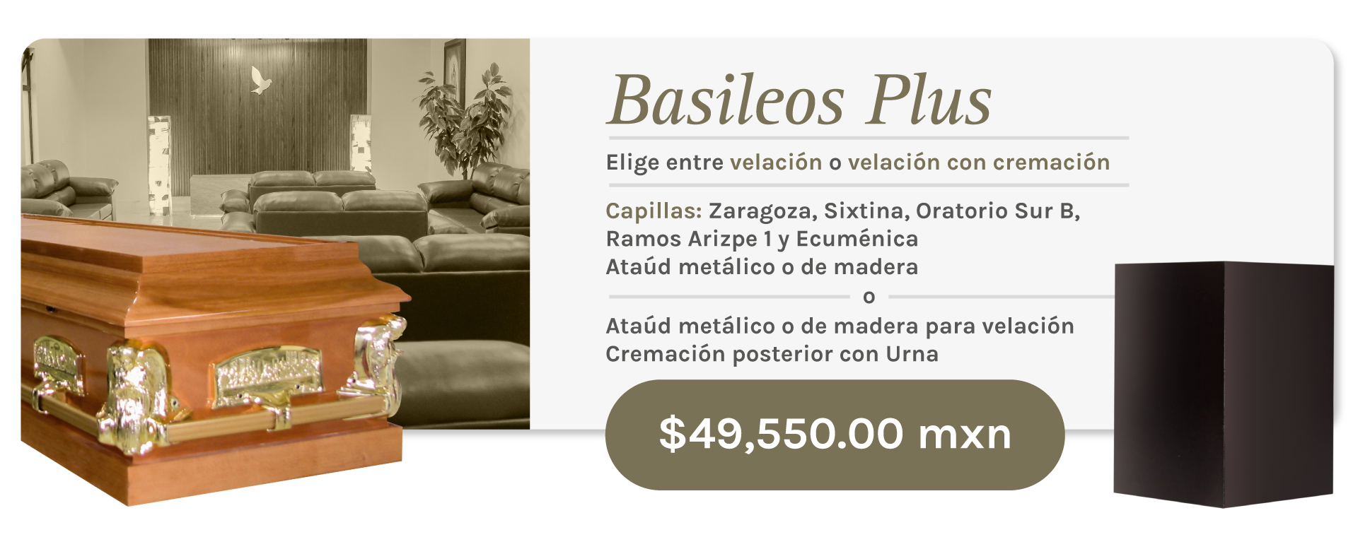 B. Servicio de Velación en Ataúd Metálico o de Madera (sólo para velación) con posterior cremación y urna incluida.